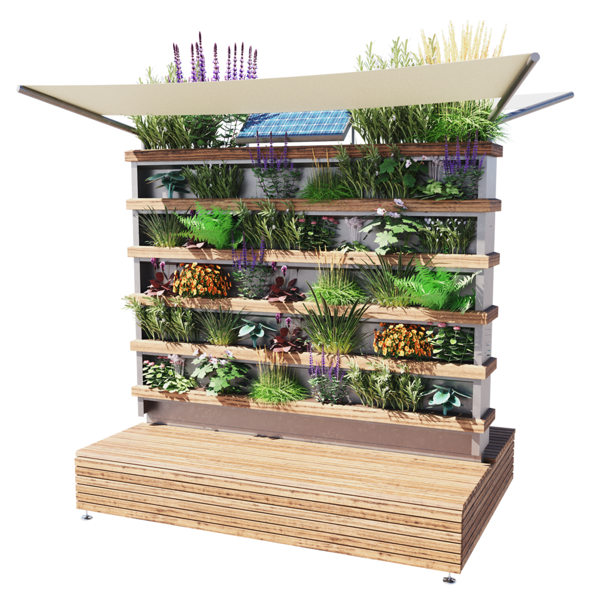 Mit der beidseitigen Begrünung bietet dieses System den maximalen Benefit für Plätze, Fußgängerzonen oder andere Freiflächen. Auf einer Stellfläche von nur 3 Quadratmeter können bis zu 80 unterschiedliche Stauden und Kräuter untergebracht werden. Dass sind ca. 9 Quadratmeter bunte und wohlriechende Natur. Zugleich werden Sitzmöglichkeiten für bis zu acht Personen geboten. Durch seine besondere Bauart lässt sich das System problemlos mit einem Hubwagen transportieren.