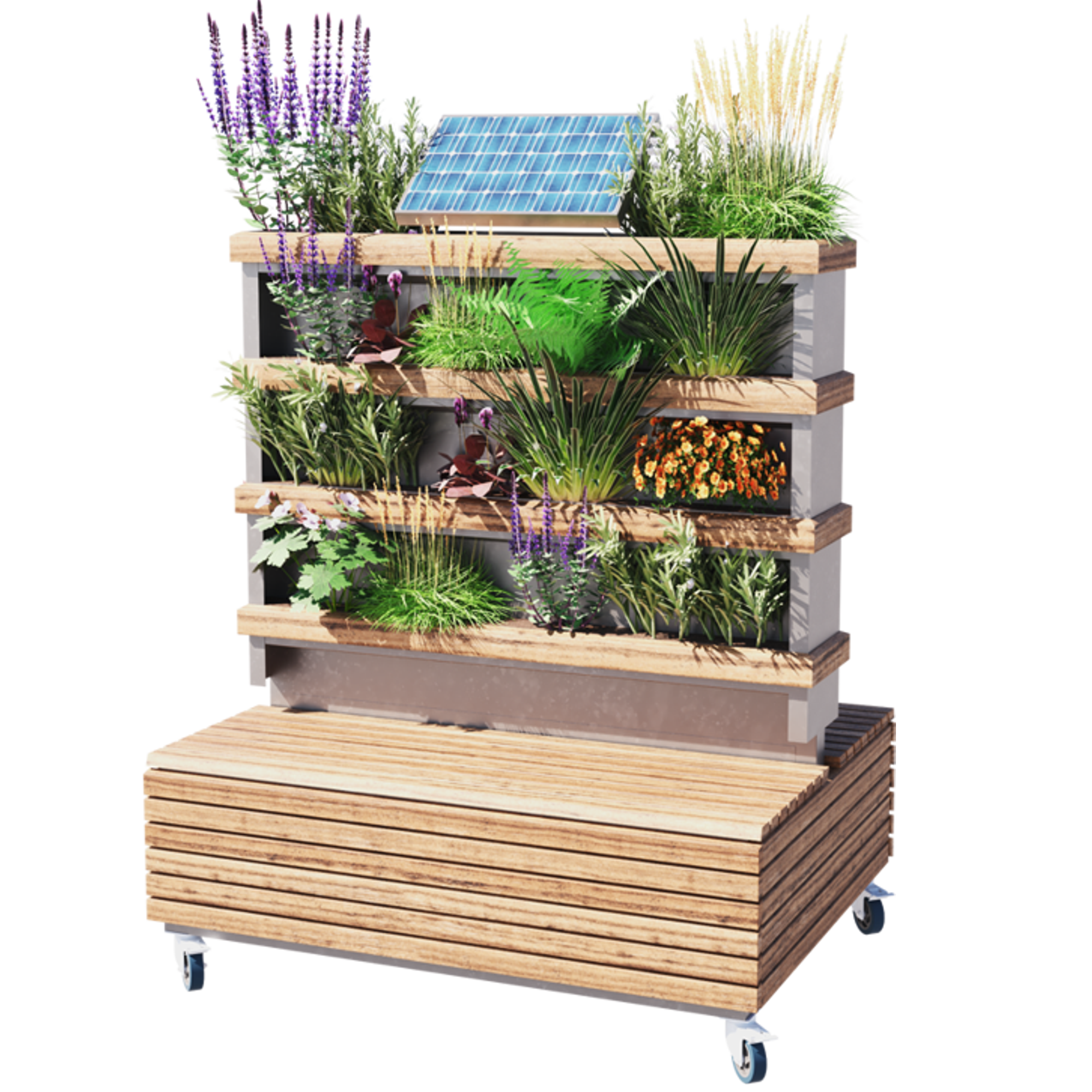 Unkompliziert einem Hochdachkastenwagen oder PKW-Anhänger transportierbarIntegrierter WassertankAutomatische aktive Bewässerungstechniken mit Energie aus SolarzellenOrganisches und torffreies MobiGa-Spezialsubtrat mit LangzeitdüngungSitzbank und Verkleidung aus extrem langlebigen, FSC®-zertifiziertem Kebony-KiefernholzZahlreiche Optionen möglich (Nisthilfe für Wildbienen, Illumination, Info- und Werbetafeln, Smart City Anbindung u.v.m.)