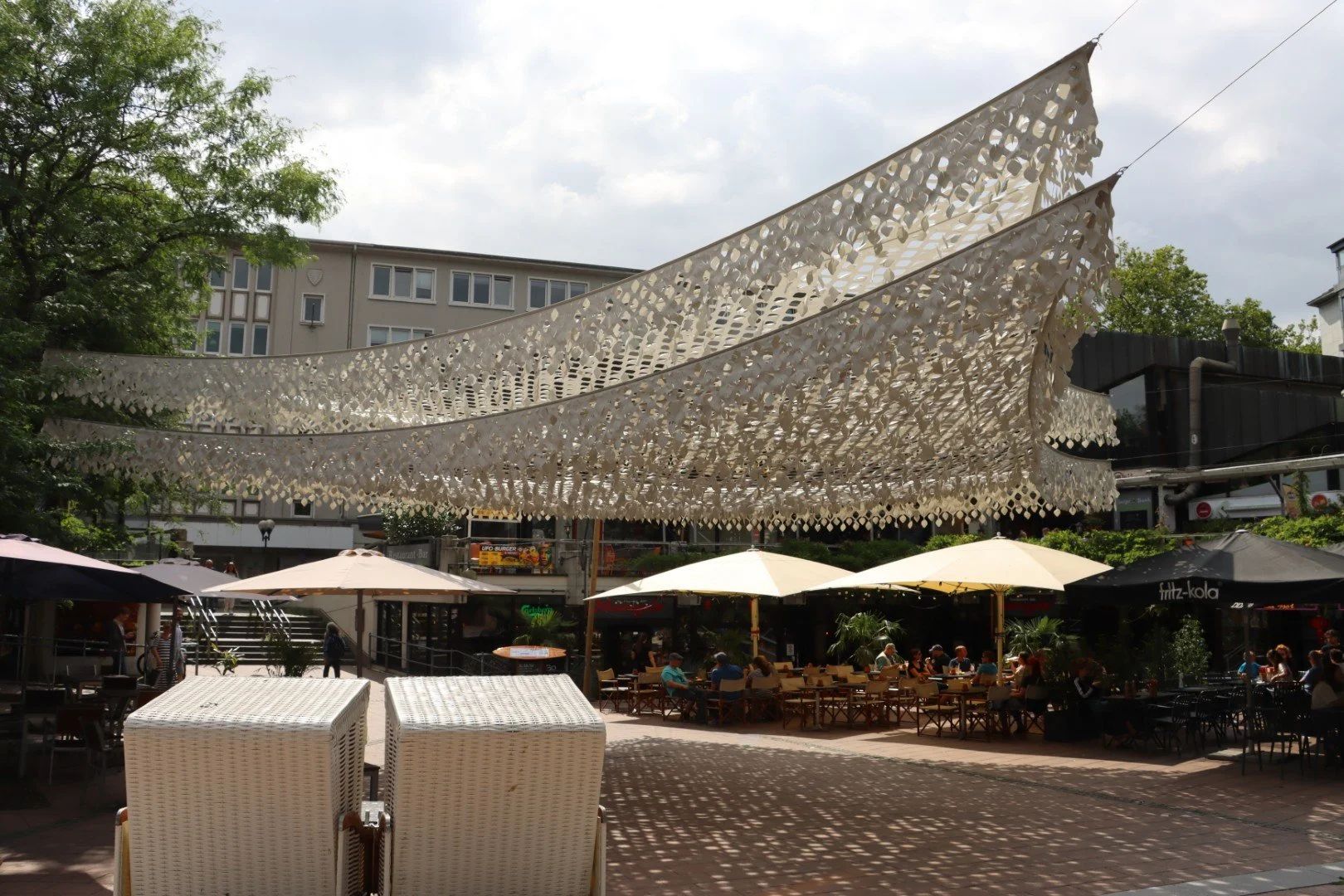 Das schattierende Muster bietet nicht nur Schutz vor Sonne, sondern schafft Atmosphäre, Ruhe und Aufenthaltsqualität in mitunter harten, urbanen Umgebungen.